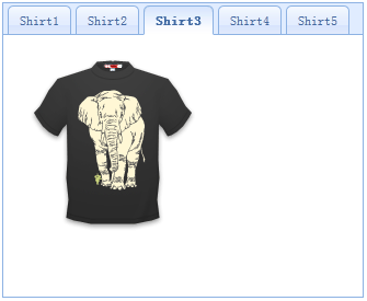<div id="tt" class="easyui-tabs" style="width:330px;height:270px;"> <div title="Shirt1" style="padding:20px;"> <img src="images/shirt1.gif"> </div> <div title="Shirt2" style="padding:20px;"> <img src="images/shirt2.gif"> </div> <div title="Shirt3" style="padding:20px;"> <img src="images/shirt3.gif"> </div> <div title="Shirt4" style="padding:20px;"> <img src="images/shirt4.gif"> </div> <div title="Shirt5" style="padding:20px;"> <img src="images/shirt5.gif"> </div> </div>