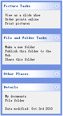 <div style="width:200px;height:auto;background:#7190E0;padding:5px;"> <div class="easyui-panel" title="Picture Tasks" collapsible="true" style="width:200px;height:auto;padding:10px;"> View as a slide show<br/> Order prints online<br/> Print pictures </div> <br/> <div class="easyui-panel" title="File and Folder Tasks" collapsible="true" style="width:200px;height:auto;padding:10px;"> Make a new folder<br/> Publish this folder to the Web<br/> Share this folder </div> <br/> <div class="easyui-panel" title="Other Places" collapsible="true" collapsed="true" style="width:200px;height:auto;padding:10px;"> New York<br/> My Pictures<br/> My Computer<br/> My Network Places </div> <br/> <div class="easyui-panel" title="Details" collapsible="true" style="width:200px;height:auto;padding:10px;"> My documents<br/> File folder<br/><br/> Date modified: Oct.3rd 2010 </div> </div>