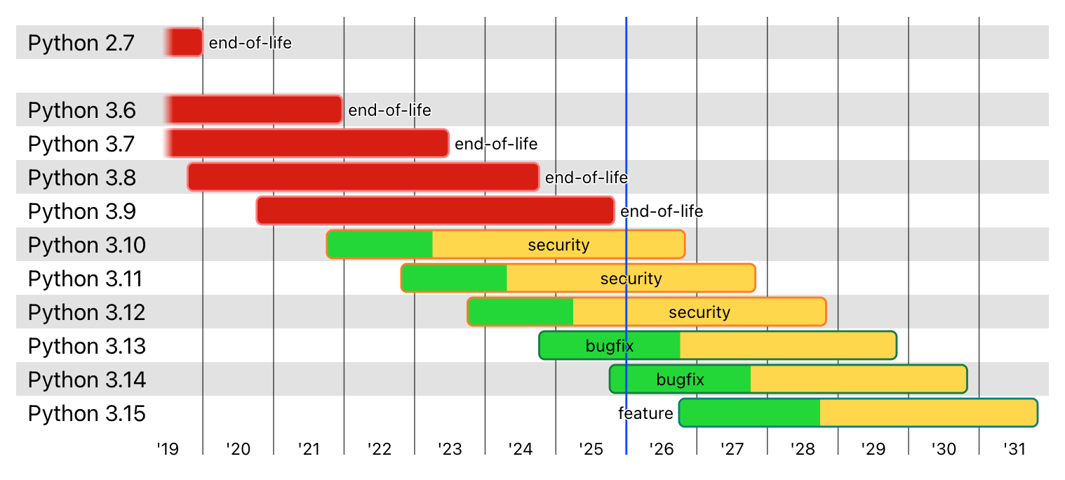下图展示了 Pyhton 的历史版本及未来版本的维护与发布时间: